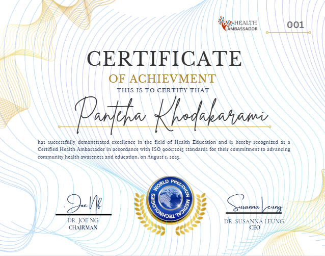 Dr. Panteha Khodakarami, Ph.D. in Business Development, is a distinguished scholar and the first certified Health Ambassador under this program. Holding a Canadian work permit, she combines expertise in innovation, academic mentorship, and research dissemination to bridge health education and strategic growth. Recognizing the program’s potential, she pioneers its integration of business acumen with community wellness leadership.